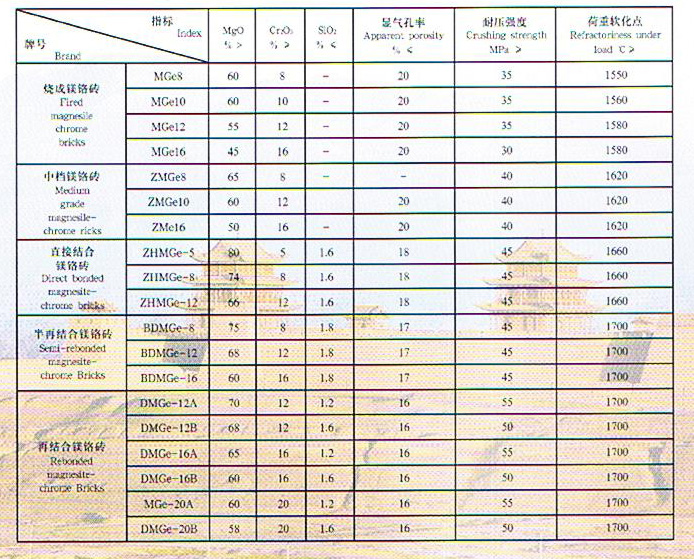 鎂鉻磚:是以燒結鎂砂和氧化鉻為原料經高壓成型、高溫燒成制得,具有熱膨脹系數小、抗熱震性能好,抗渣性強等特點,廣泛用于水泥窯、有色冶金爐、玻璃窯蓄熱室等各種工業窯爐。